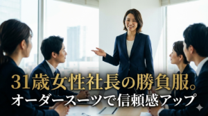 31歳女性社長の勝負服。オーダースーツで信頼感アップについて書いています。実力があっても、第一印象で不利になってしまう。それは装いが、あなたの実力を正確に伝えていないからかも。重要な場面で信頼感を勝ち取るためにそのベストな装いを提案します。