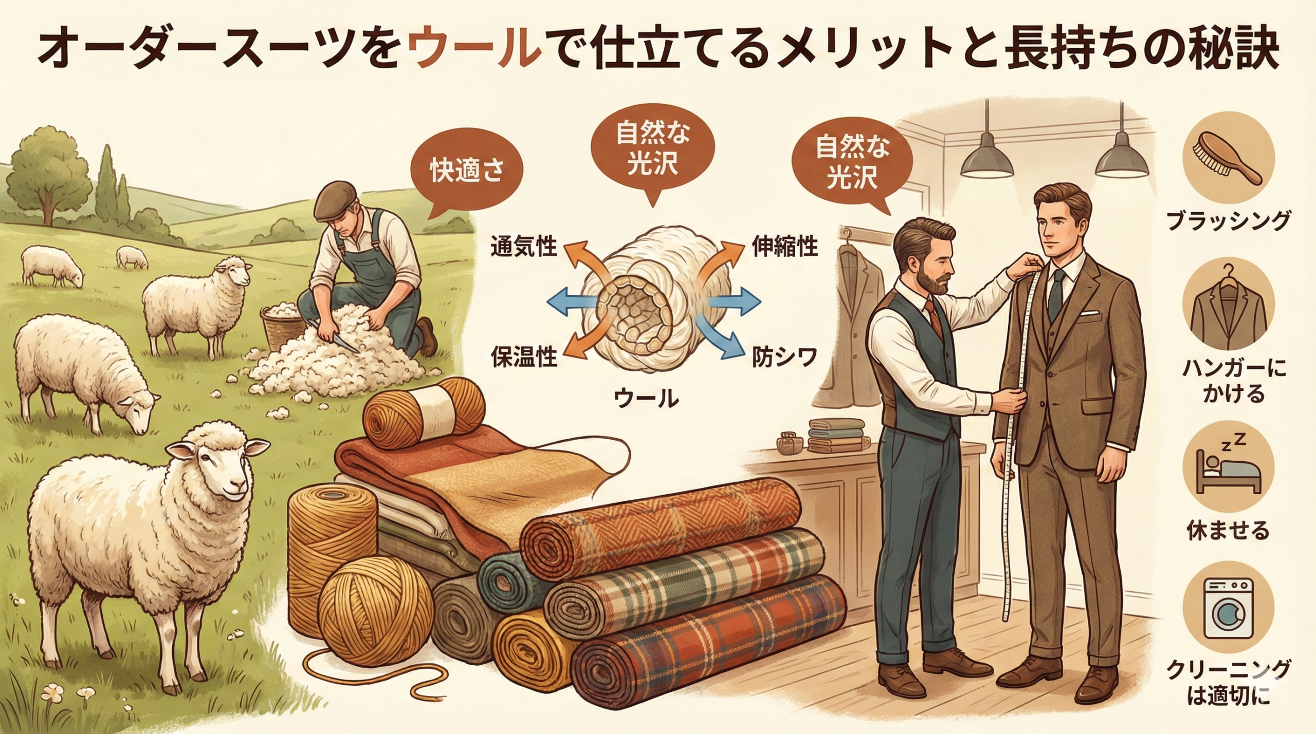 ウールは数ある繊維の中で、スーツ生地として最も適した素材です。その理由は、天然繊維ならではの優れた機能性にあります。