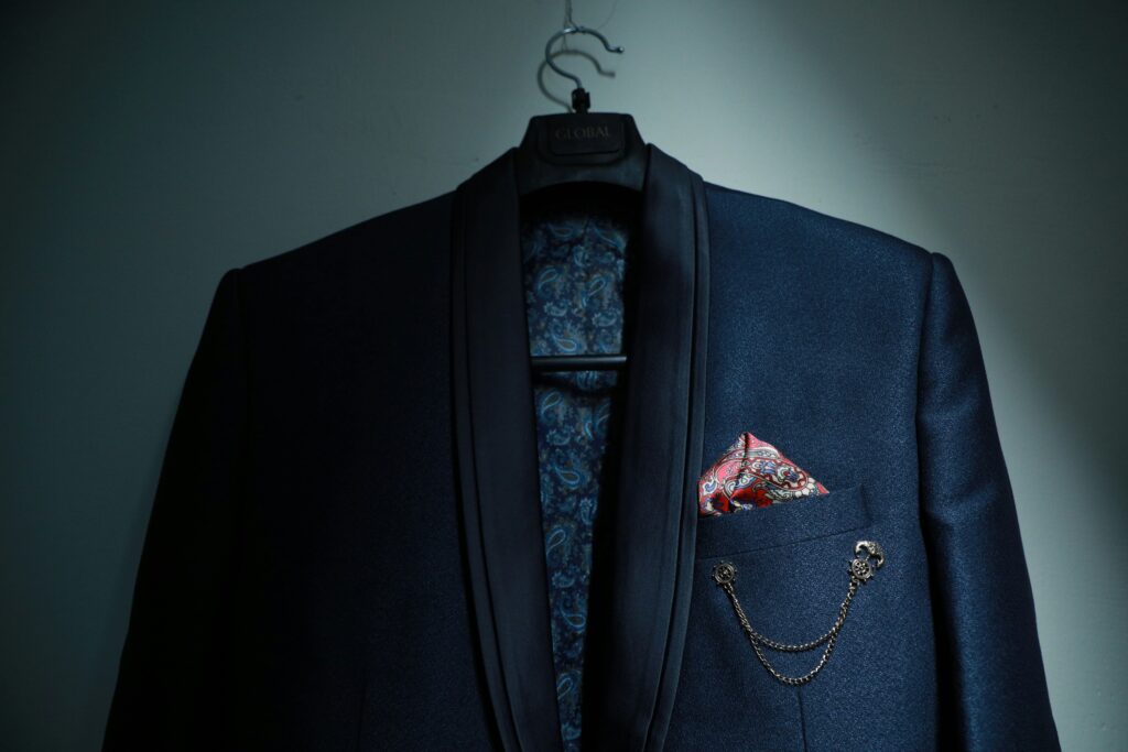 オーダーでジャケットの胸ポケット位置やサイズが整っていると、チーフもきれいに収まり、全体のバランスがより良く見えます。